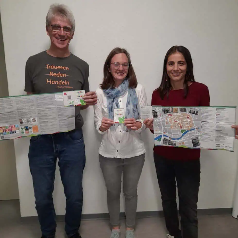 Die Projektgruppe „Nachhaltigkeitskarte Herborn“ ist stolz auf die druckfrischen Taschen-Faltpläne, die nun in Herborn über sozial-ökologische und nachhaltige Initiativen informiert. v.l. Frank Sträßer, Vorsitzender des Herborner Weltladen e.V., mit Brit Neunzerling und Diana Göbel.