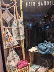 Im Januar finden Sie in unserem Schaufenster (und natürlich im Laden) viele Beispiele für Produkte aus fairem Handel die nachhaltig produziert sind und Ihren Haushalt nachhaltiger gestalten