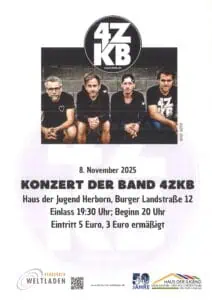 Am 08.11. um 20:00 Uhr findet im Haus der Jugend in Herborn ein Konzert mit der Limburger Band „4 Zimmer Küche Bad“ statt.